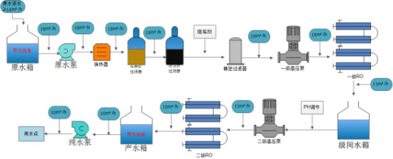 原水→原水箱→原水提升泵→板式換熱熱器石英砂過濾器→活性炭過濾器→阻垢劑→保安過濾器→一級高壓泵→一級RO主機→級間水箱→PH調(diào)節(jié)系統(tǒng)→二級高壓泵→二級RO主機→產(chǎn)水箱→純水泵→用水點