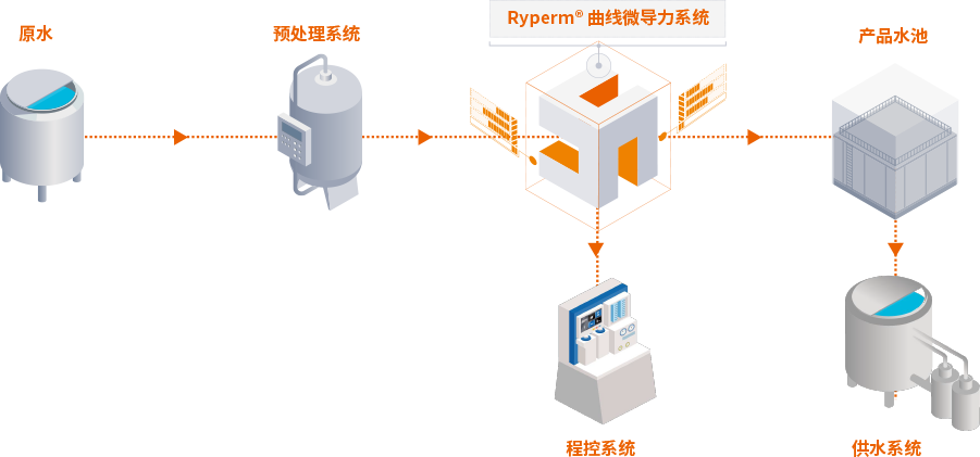 Ryperm®曲線微導力系統主要服務于工業生產用水、養殖和灌溉用水、鍋爐補給水,以及水資源匱乏地區或高水費地區。與常規設備相比,水利用率提高10-20%,能耗降低10-20%。大幅降低企業用水總量,實現可持續發展。