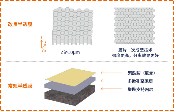 膜片采用一次成型技術,膜片厚度(Z)≥10μm,是常規半透膜(聚酰胺)的50倍以上,提高膜的耐用性。獨特膜結構設計使得膜的耐壓性有顯著提升。膜元件開孔率高,可降低進膜壓力,在保證產水質量、高回收率的前提下,節能降耗。